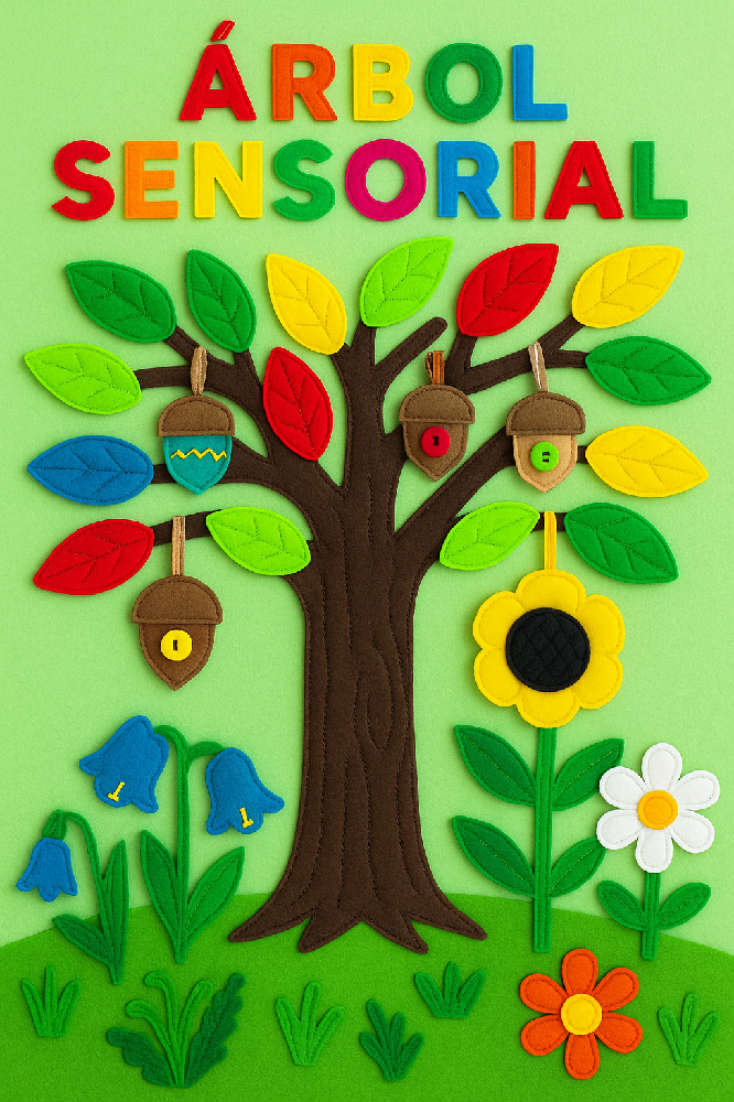 ✨ ¿Qué es el Árbol Sensorial?Se trata de un mural de tela de gran formato, elaborado con fieltro de alta calidad, donde un árbol central está acompañado de elementos móviles y sensoriales como: