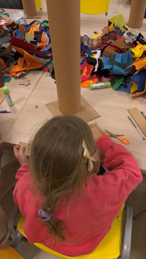 La propuesta invitó a cada familia a construir su tótem vertical único, decorándolo con ojos, plumas, formas geométricas, animales imaginarios o símbolos personales. Todo con materiales reutilizados, sin necesidad de coser, en un ambiente relajado y colaborativo donde la creatividad fluyó con naturalidad.