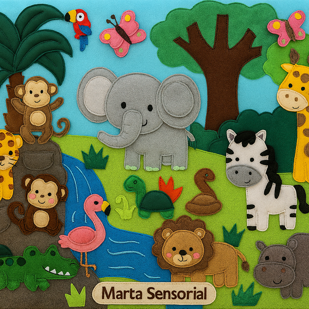 El mural sensorial de fieltro Jungla de Marta Sensorial es un gran panel didáctico interactivo diseñado para estimular el aprendizaje infantil a través del juego y la exploración táctil. Este mural educativo transforma la pared en un espacio vivo donde los niños pueden tocar, manipular y descubrir diferentes elementos inspirados en la naturaleza y los animales de la selva.